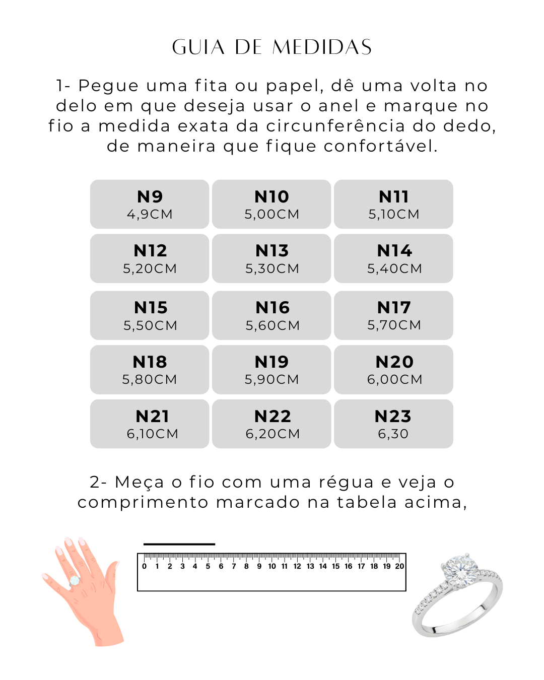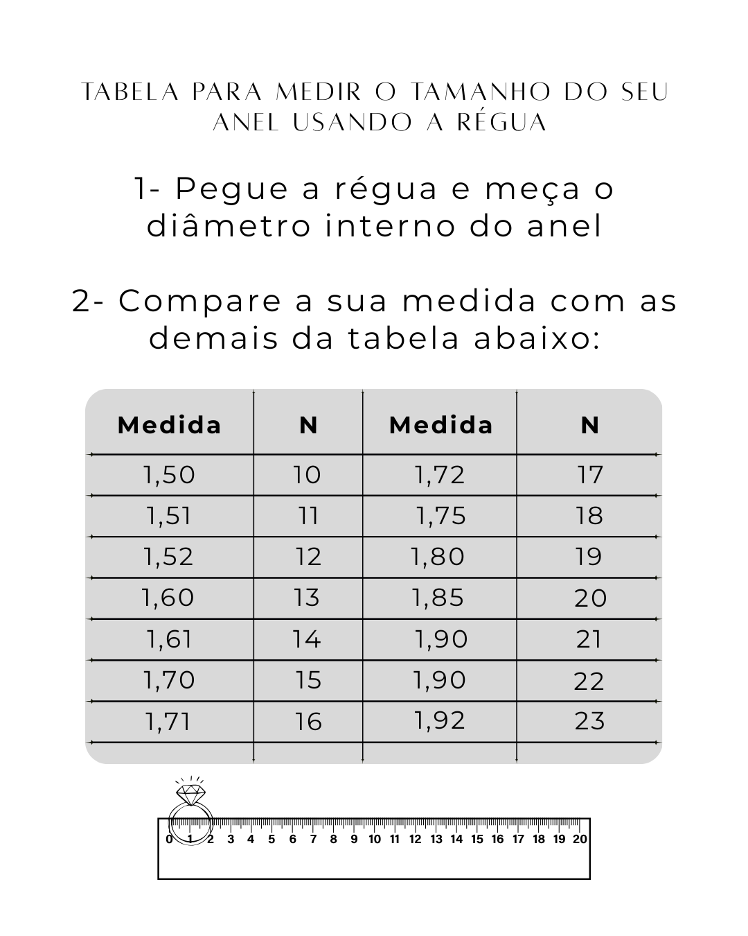 Pegue um anel antigo que sirva bem e meça a parte interna dele com uma régua. Em seguida, consulte a tabela abaixo: o valor em centímetros indicará o número correspondente. Importante: faça a medição bem no centro do anel para garantir o resultado correto.